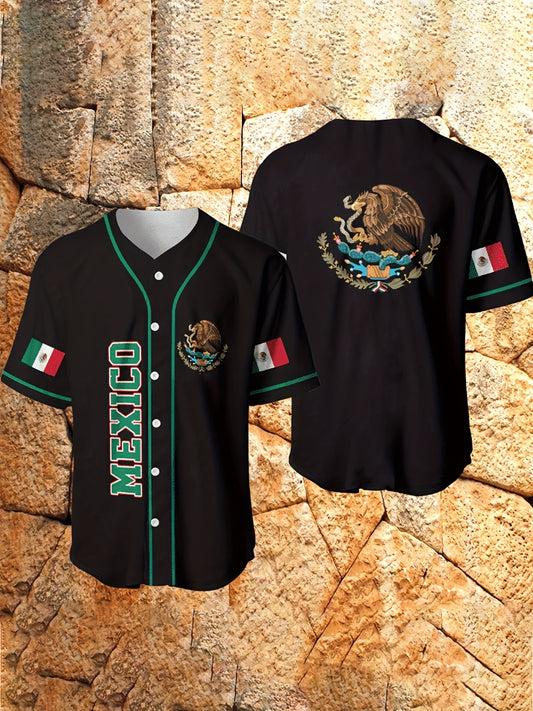 Men's Stylish Eagle Pattern Baseball Jersey, Casual Breathable Baseball Collar Button Up Short Sleeve Tee Top For Playing Baseball