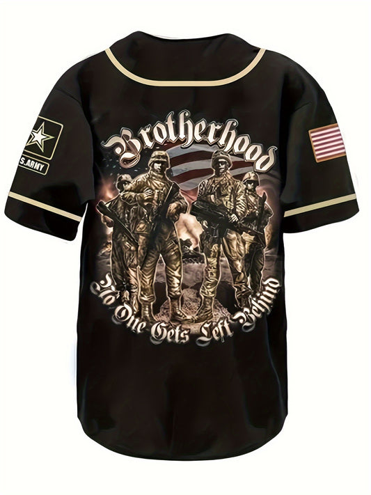 Vintage Soldier And Letter Graphic Pattern Men's Short Sleeve V-neck Button Up Baseball Jersey, Men's Summer Sports Shirt, Gift For Men