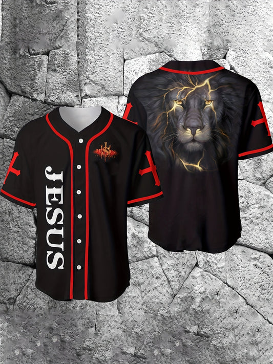 Men's Stylish Lion Pattern Baseball Jersey, Casual Breathable Baseball Collar Button Up Short Sleeve Tee Top For Playing Baseball