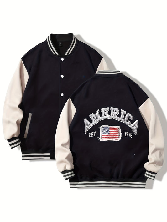 Letter Embroidery Varsity Jacket, Men's Casual Color Block Button Up Jacket For Spring Fall School Baseball
