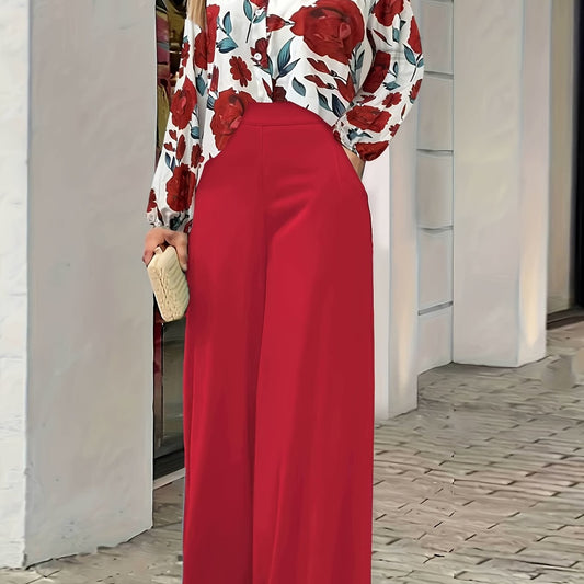 3 Two Piece Set For Women , Button Front Shirt and Plain Wide Leg Pants - 3 Colors Pack