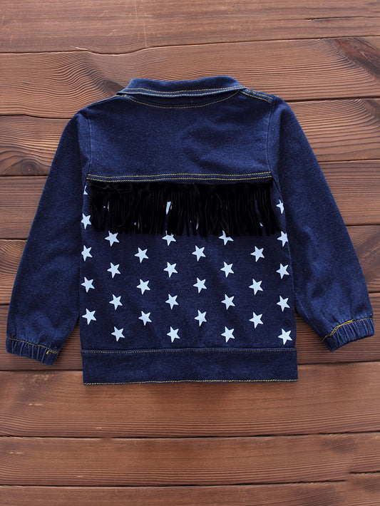3pcs Baby Boy's Cowboy Denim Outfit, Tassel Denim Jacket & Star Pattern Long Sleeve Top & Jeans Set, Baby's Clothing, As Gift