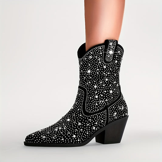 Women's Rhinestone Pattern Boots, Side Zipper Casual Chunky Heel Chelsea Boots, Western Cowboy Point Toe Boots