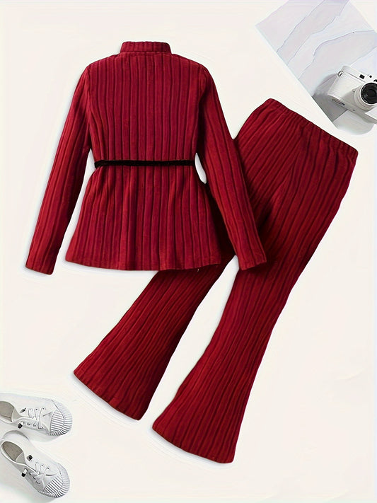 2pcc, Solid Ribbed Long Sleeve Top + Flare Pants Set Comfy Outfits For Girls Spring Fall Winter Christmas Gift