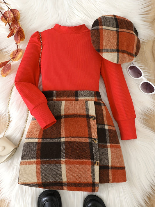 3pcs Girls Turtleneck Puff Long Sleeve Top + Plaid Skirt With Beret Kids Clothes Christmas Gift