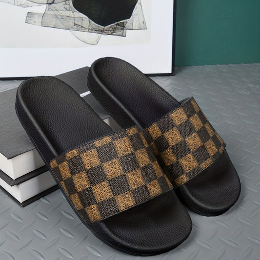 Men's Checkered Design Slides, Casual Non Slip Slippers, Open Toe Shoes For Indoor Outdoor Beach Shower, Spring And Summer