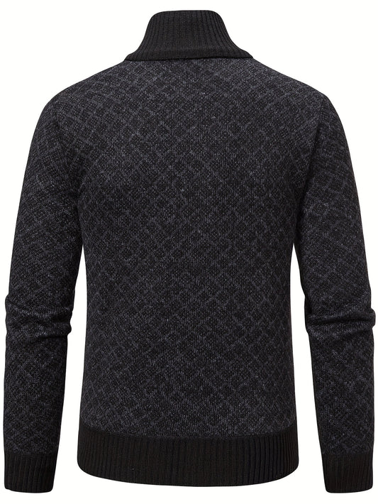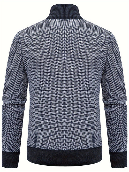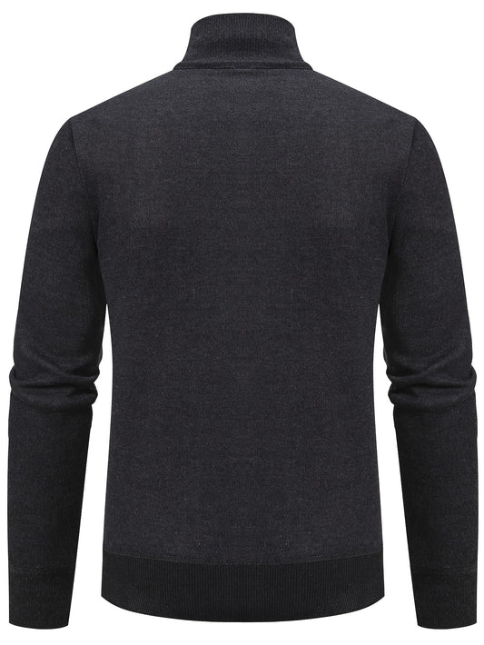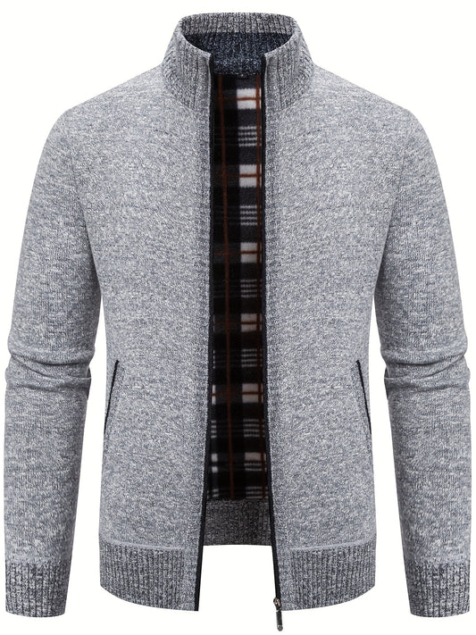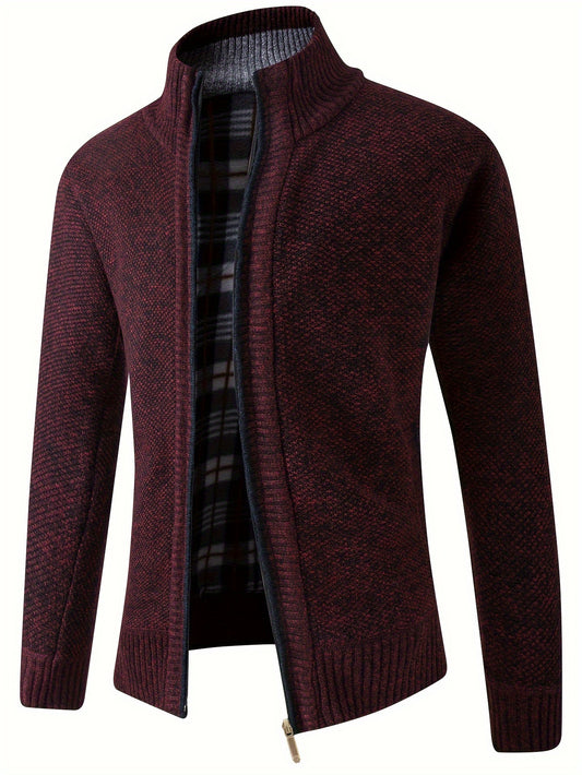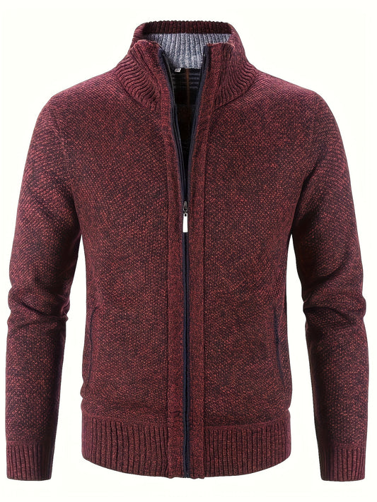 Warm Stand Collar Fleece Jacket, Men's Casual Comfortable Solid Color Zip Up Knitted Cardigan For Spring Fall
