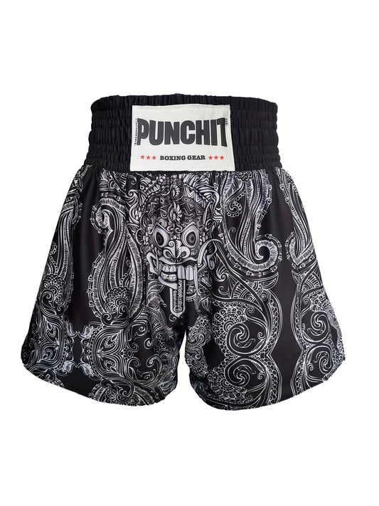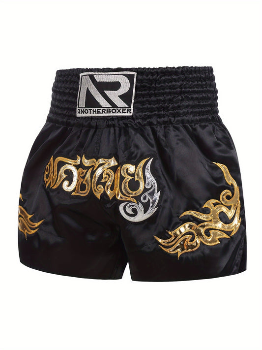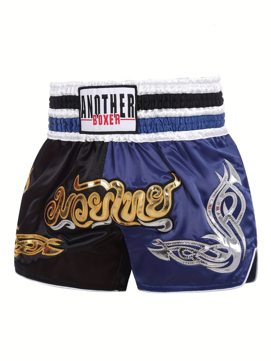 Men's Embroidery Pattern Boxing Shorts, Active Elastic Waist Sports Trunks For Boxing Workout Fighting Training