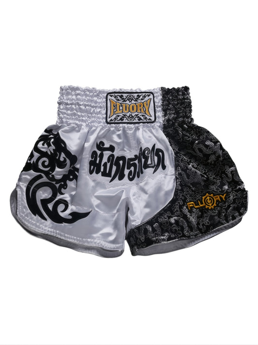 FLUORY Muay Thai Shorts, Embroidered Sports Trunks For Boxing Workout Fighting Training