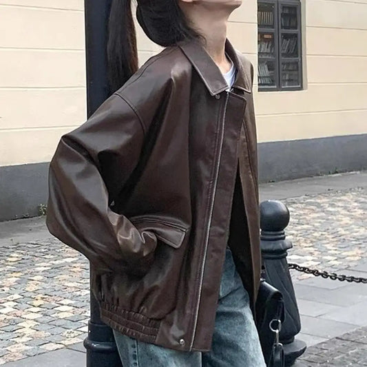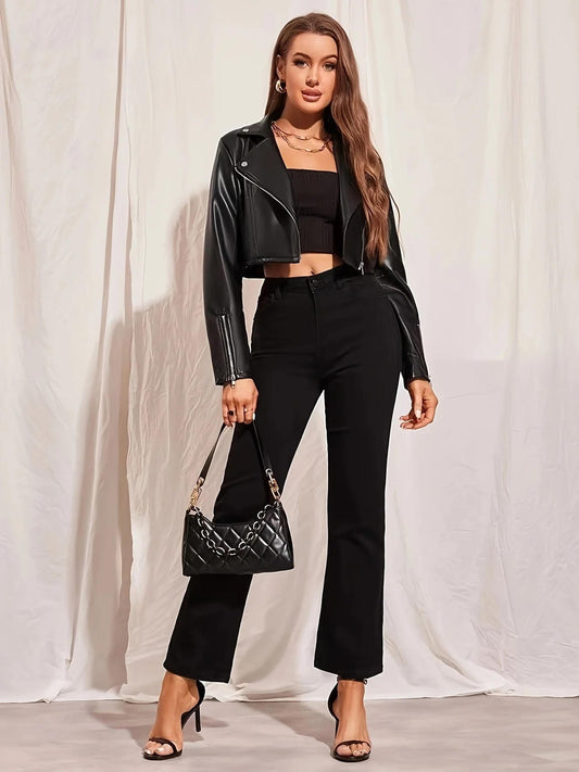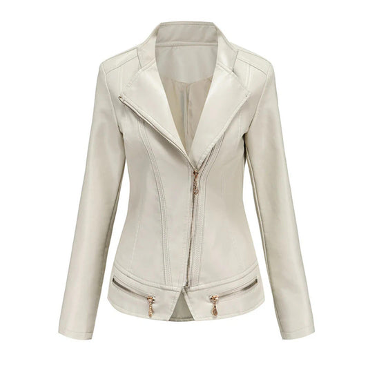 Stylish Womens Faux Leather Motorcycle Jacket with TurnDown Collar