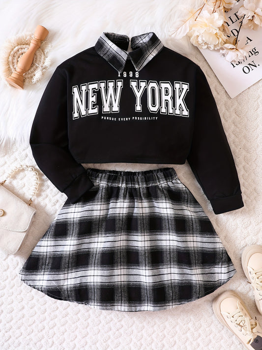 Toddler Girls Letter M Embroidery Pullover & Plaid Pleated Skirt 2pcs Casual Kids Clothes Spring Fall