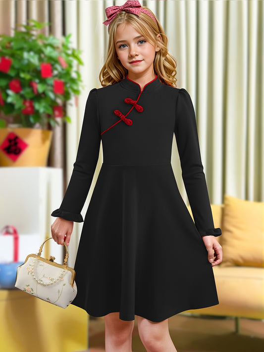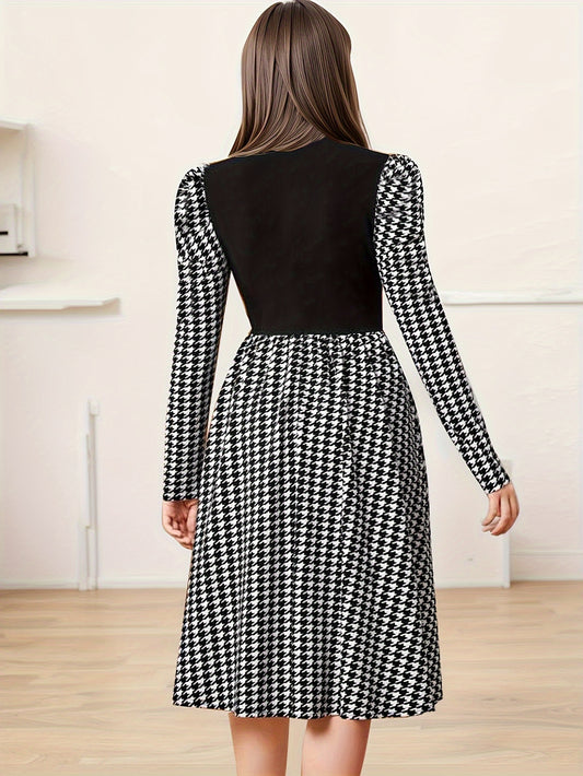 Teen Girls Teenage Houndstooth Print Stitching Puff Sleeve Casual Dress For Spring And Autumn