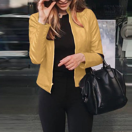 Chic Blazer For Women | Casual Leather Jacket with Stand Collar and Full Zip