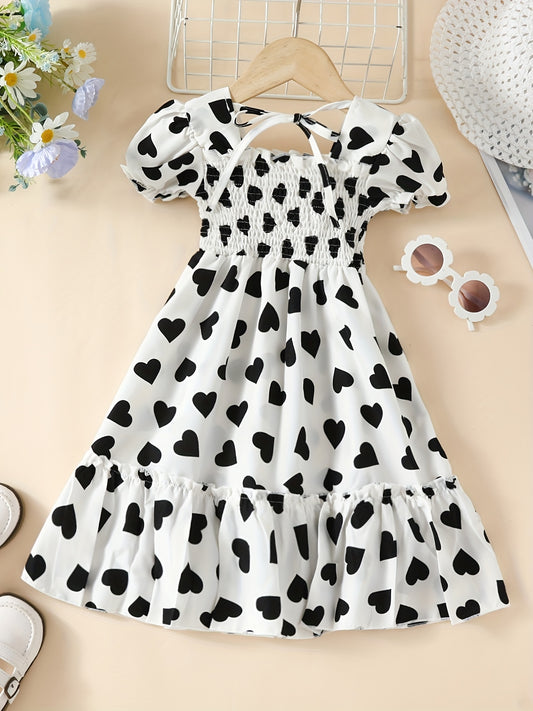 Toddler Girls Puff Sleeve Frill Trim Shirred Heart Graphic Ruffled Hem Princess Dress For Party Beach Vacation Kids Summer Clothes
