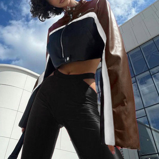 Motorcycle Color Matching Printed Zipper Short Coat For Women