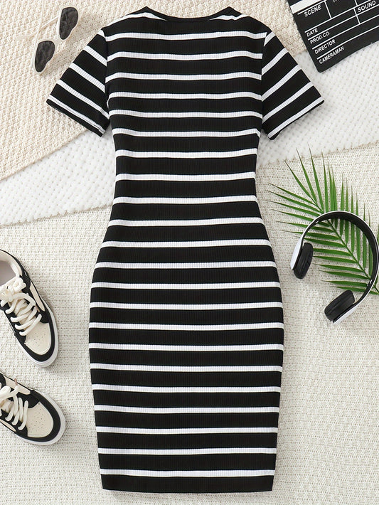 Teen Girls Fashion NEW YORK Letter Print Allover Stripe Dress Short Sleeve Crew Neck Casual Dress