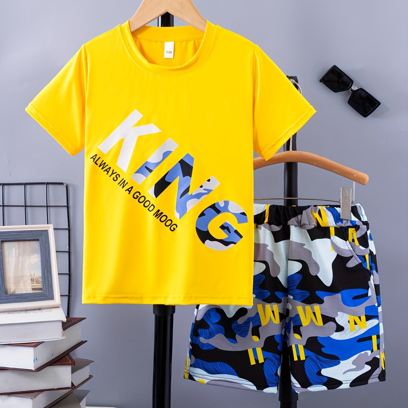 2pcs Boys Casual KING Letter Graphic Print Short Sleeve T-shirt & Camouflage Shorts Set, Comfy Summer Boys Clothes