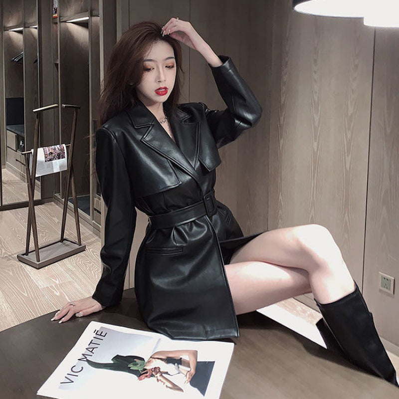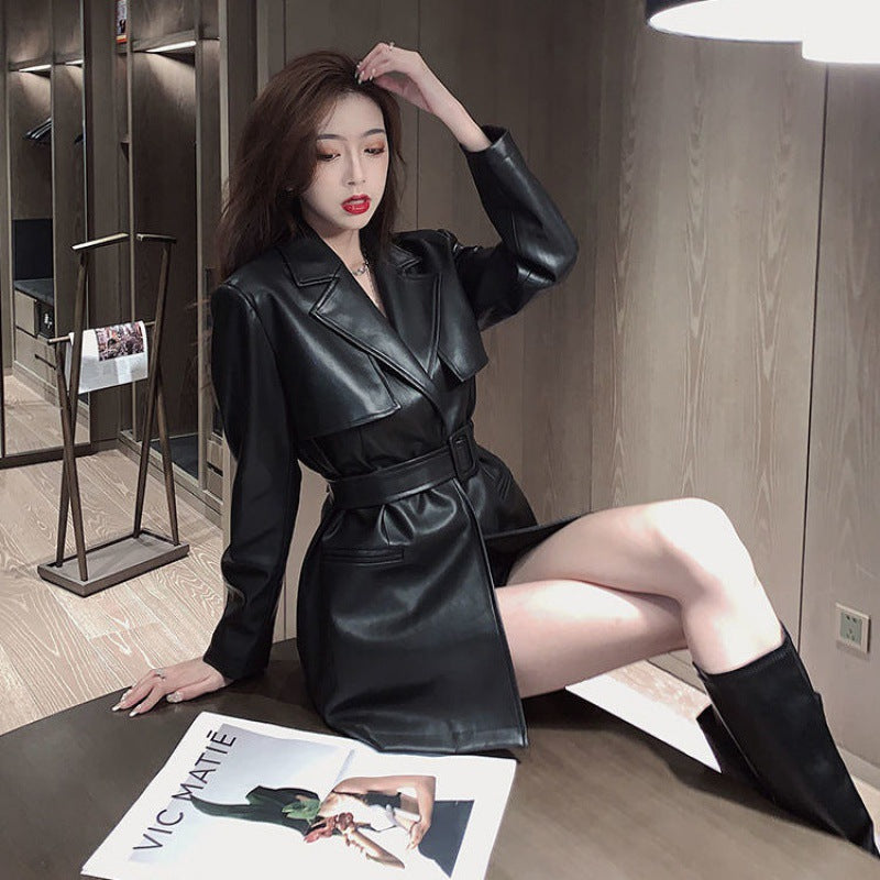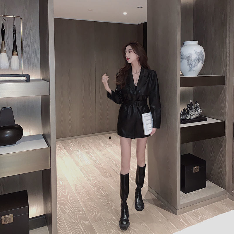Autumn And Winter New French Style Leather Jacket And Small Black Dress