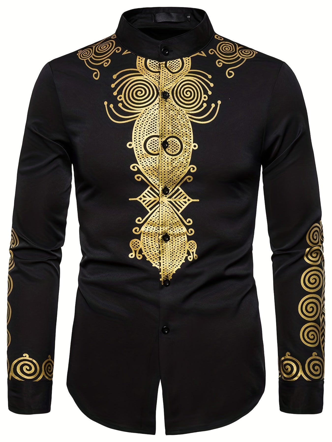 Camisa De Cuello Alto De Manga Larga Con Estampado De Tótem Para Hombre, Camisa Masculina De Estilo Étnico Para Primavera Y Otoño