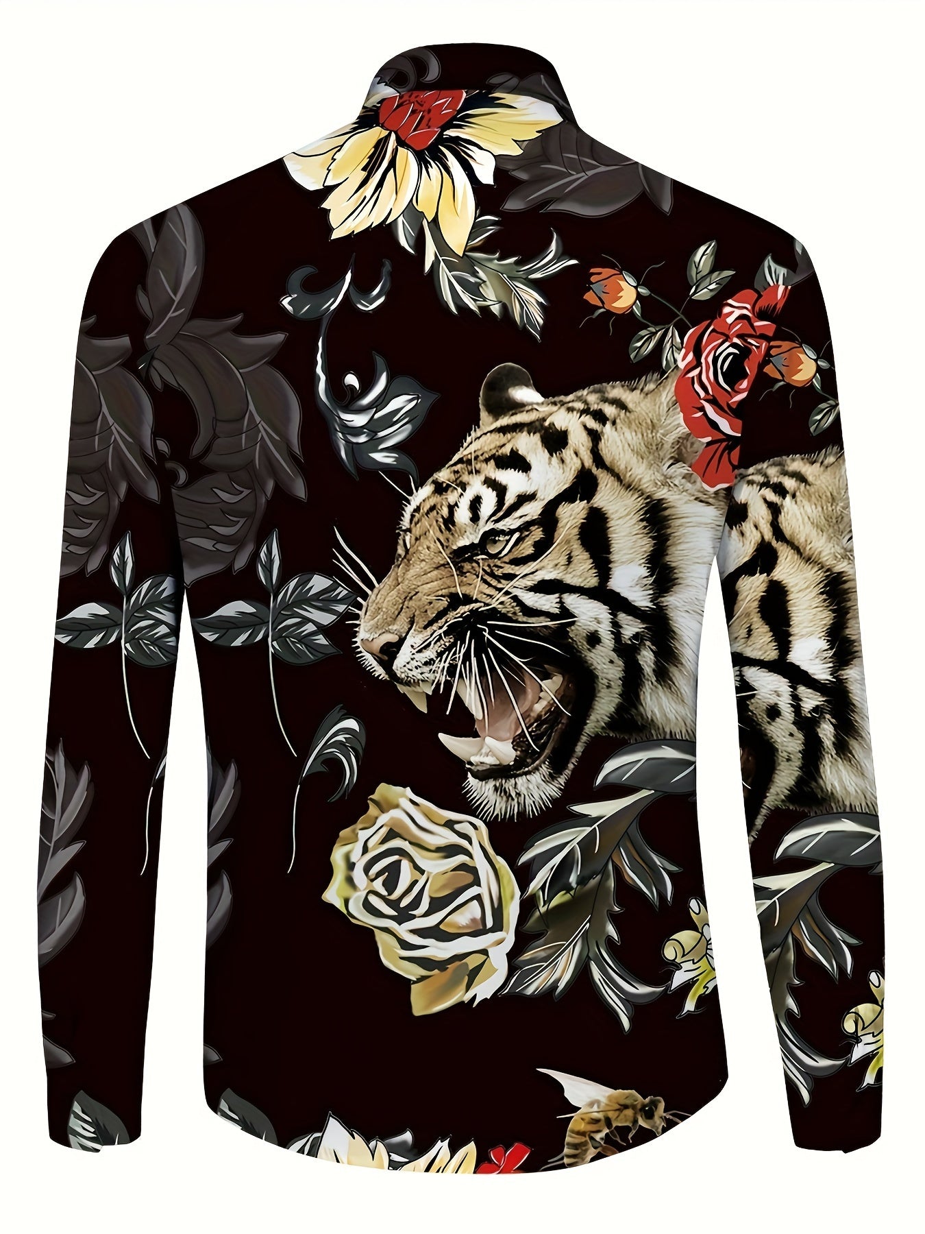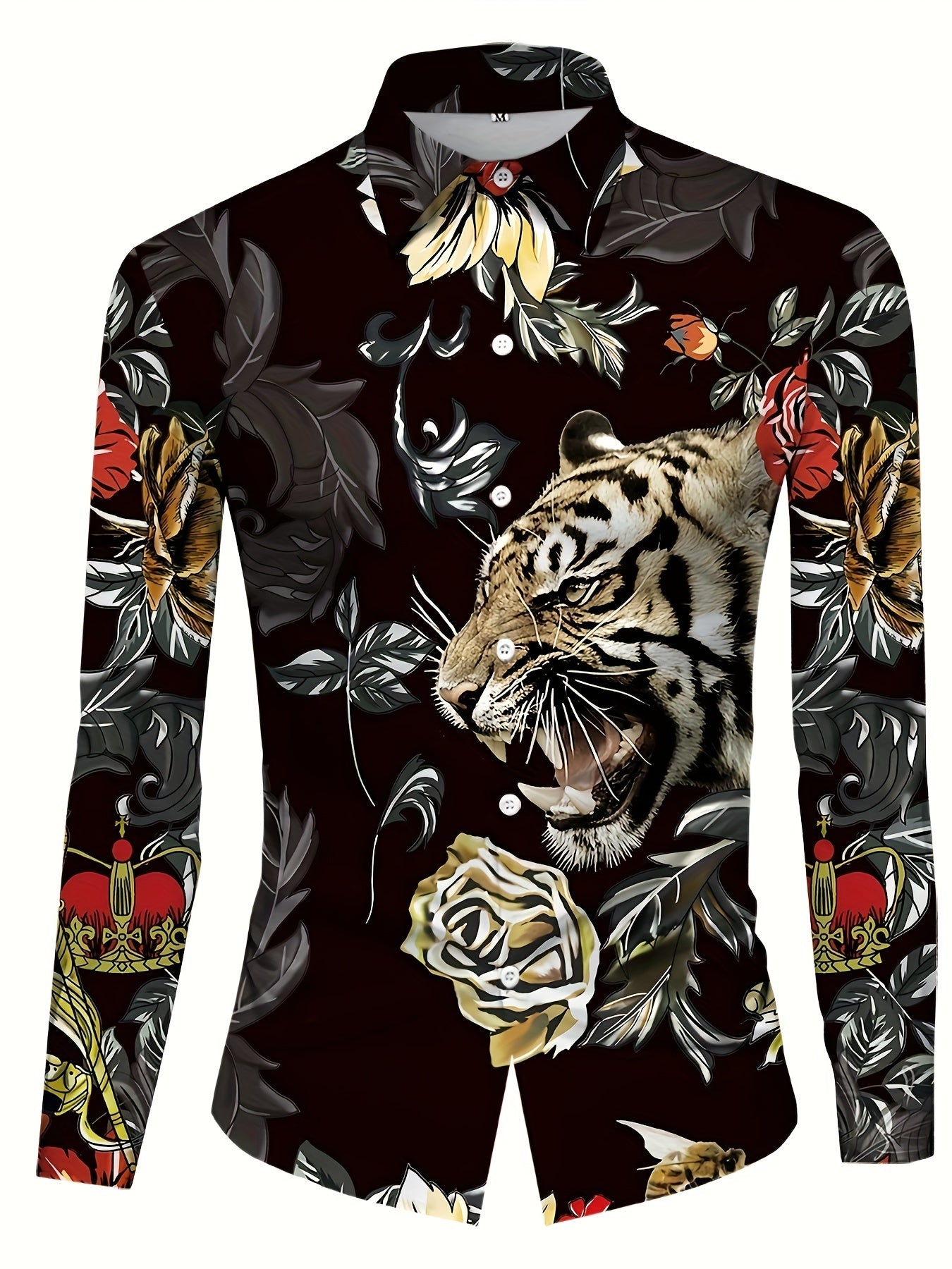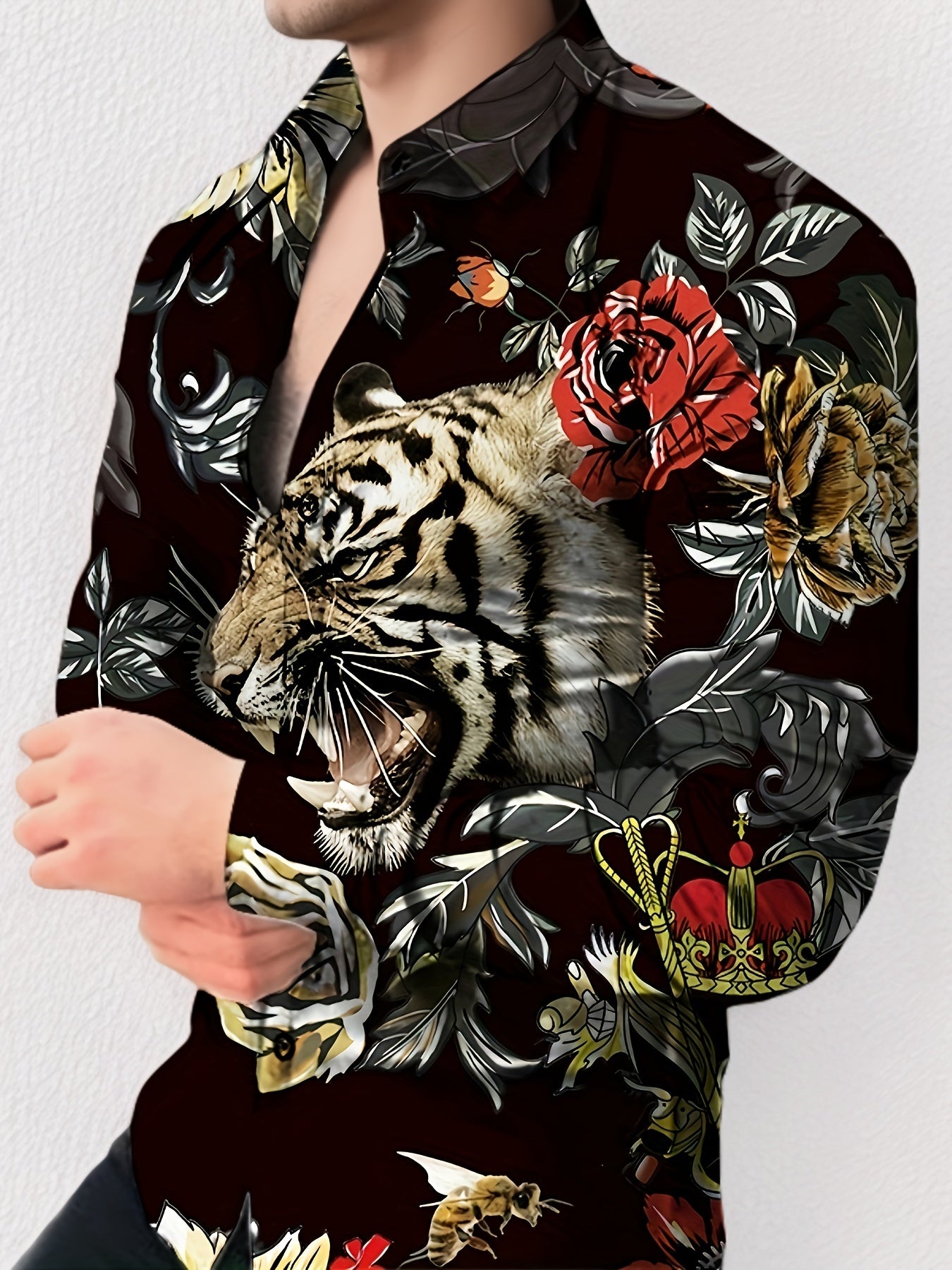 Camisa De Manga Larga Con Botones Y Estampado Gráfico En 3D De Tigre Feroz Y Flor, Para Hombre. Estilo Callejero De Primavera Y Otoño