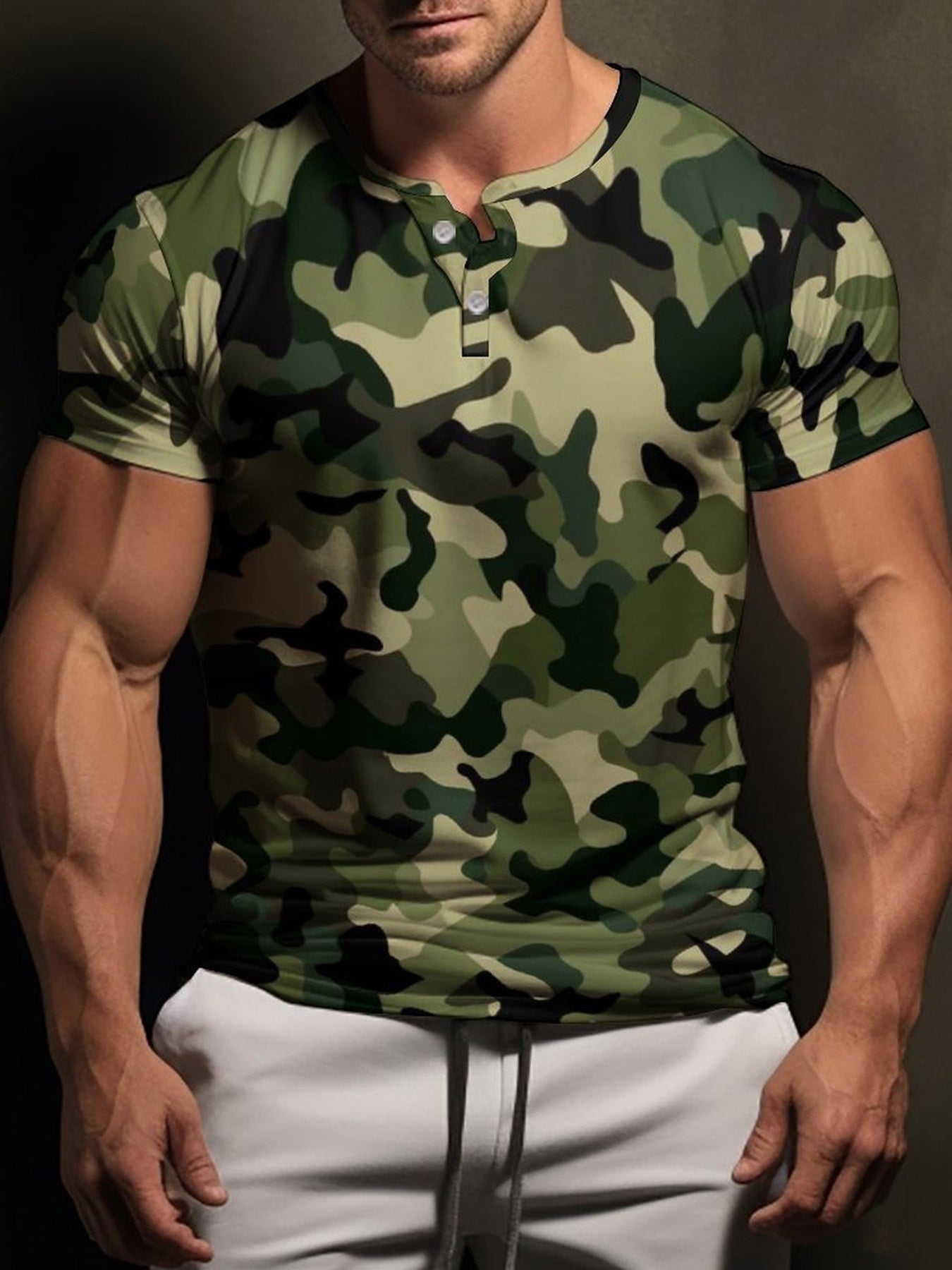 Camouflage Pattern Henley Shirt, Men's Casual Slightly Stretch Round Neck Short Sleeve Henley Shirt For Spring Summer