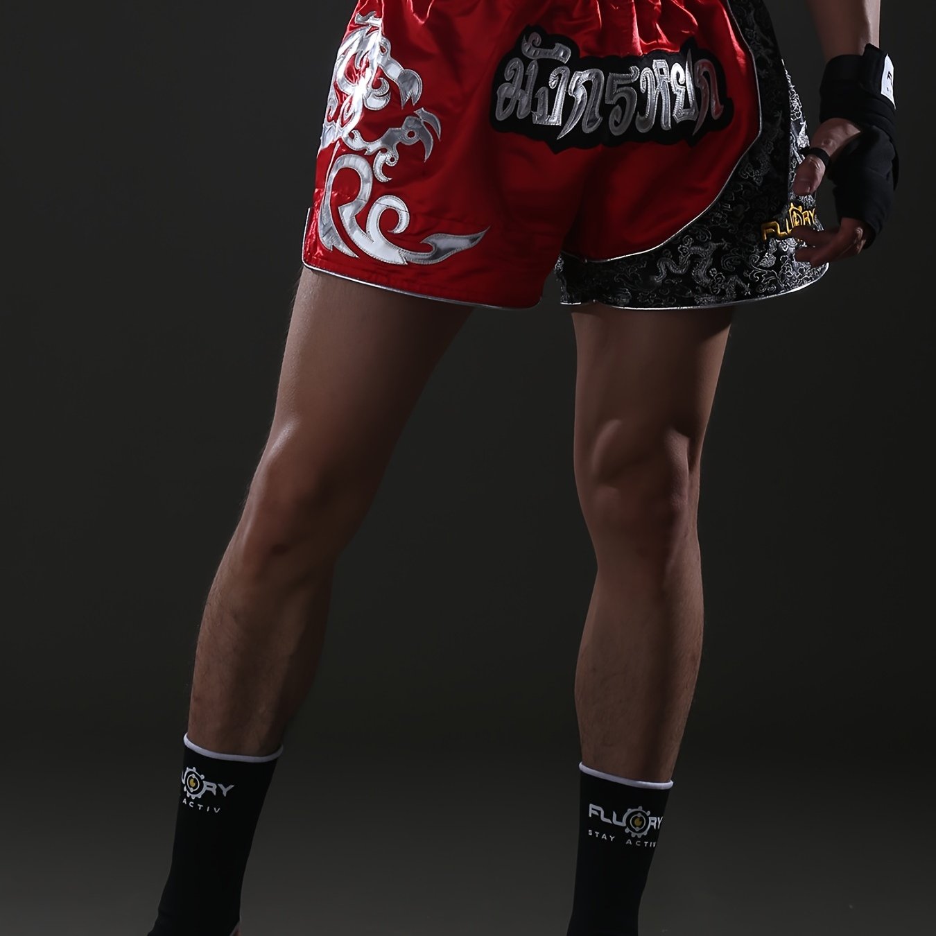 FLUORY Muay Thai Shorts, Embroidered Sports Trunks For Boxing Workout Fighting Training