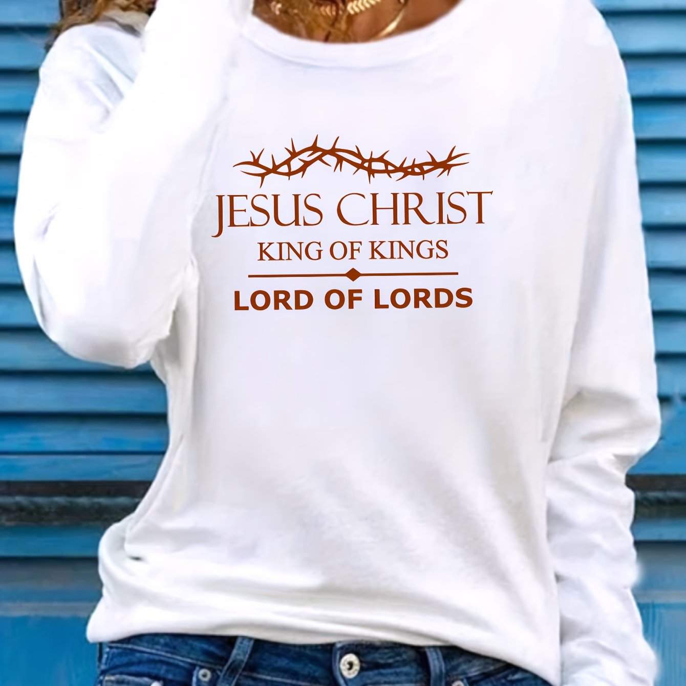 Jesus Christ Print Crew Neck T-shirt, Casual Long Sleeve Top For Spring & Fall, Women's Clothing