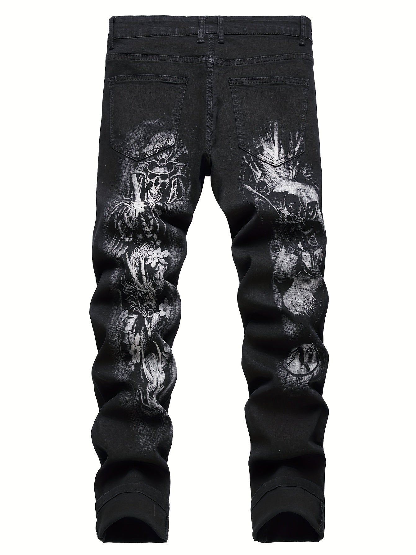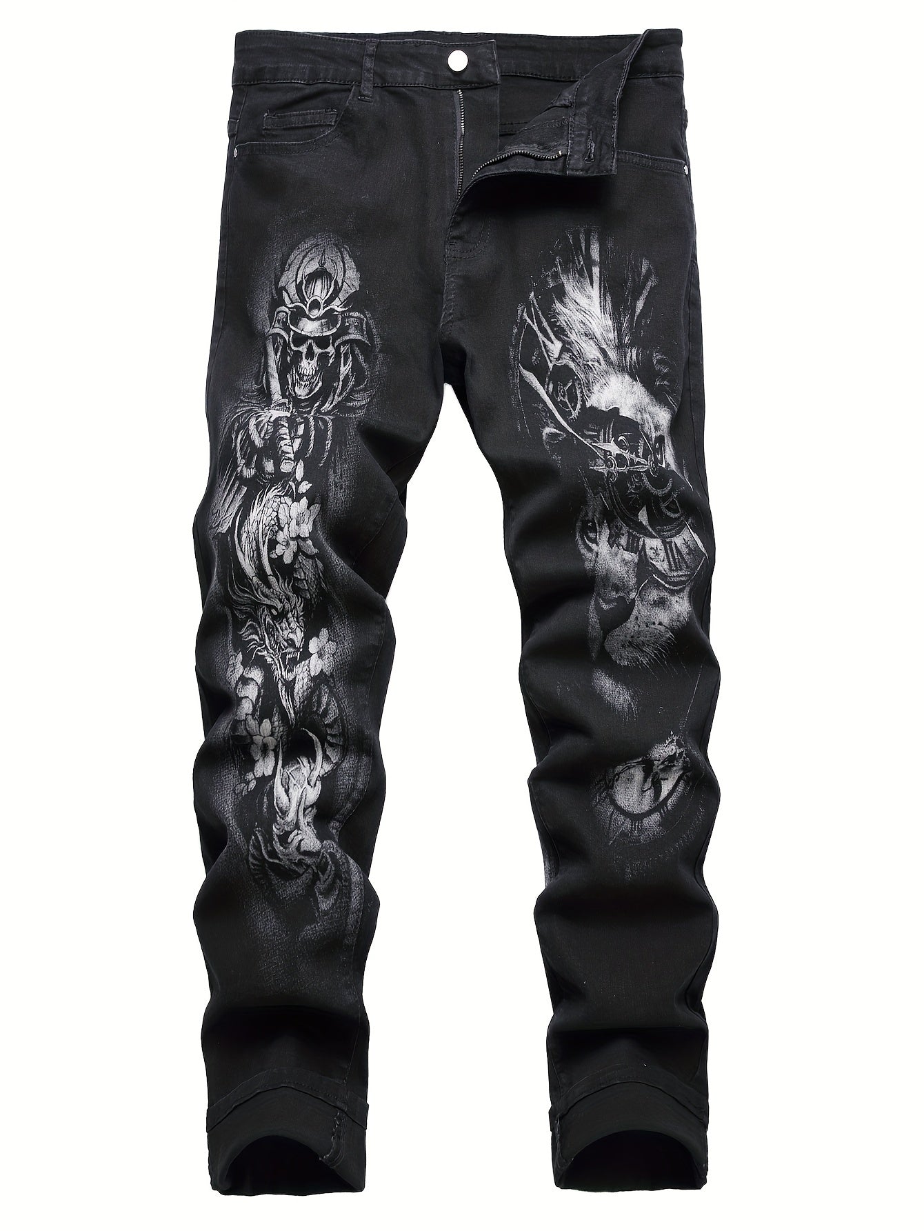 Men's Skull Pattern Washed Jeans, Trendy Novelty Denim Outdoor Pants