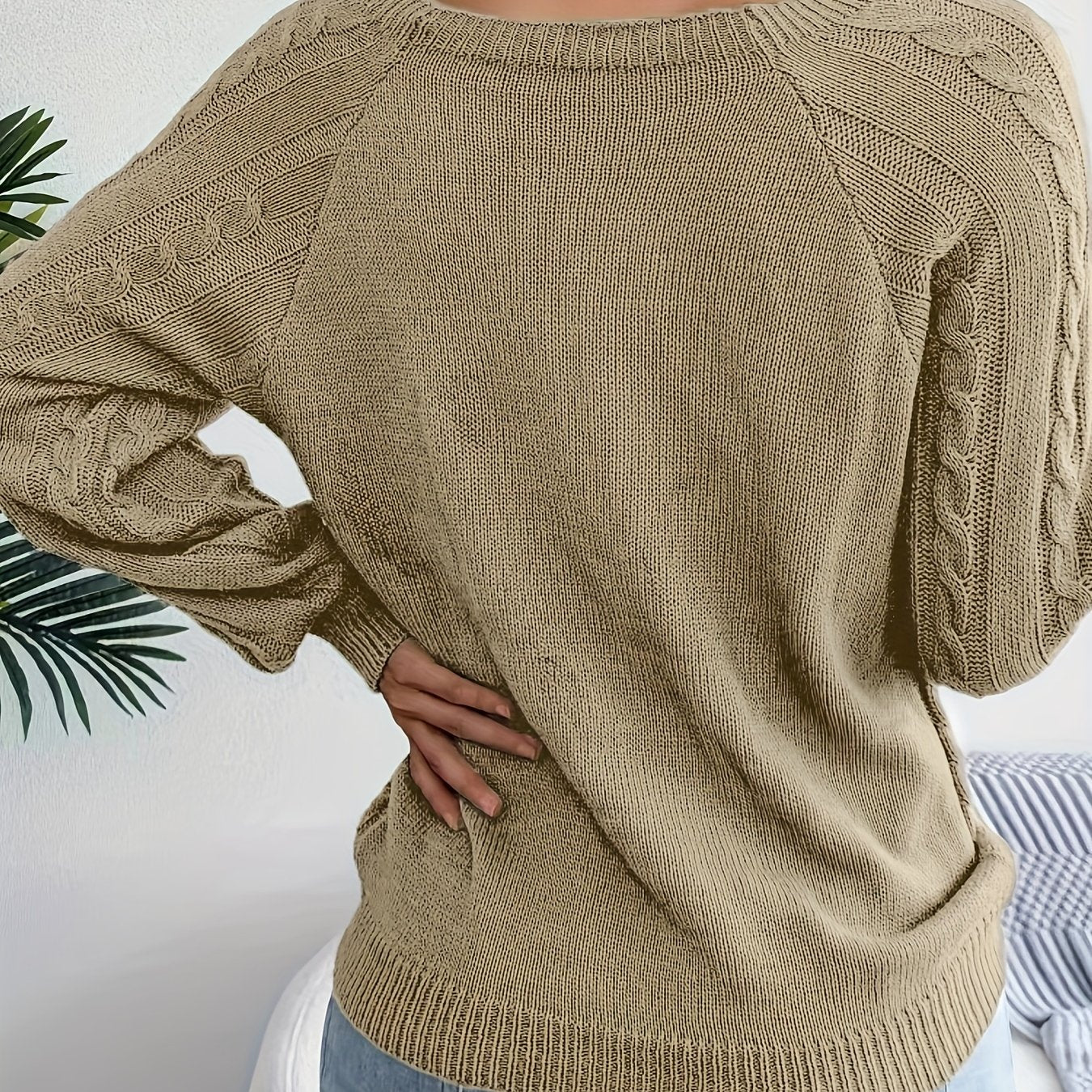 Solid Cable Knit Sweater, Casual Crew Neck Long Sleeve Sweater, Women's Clothing