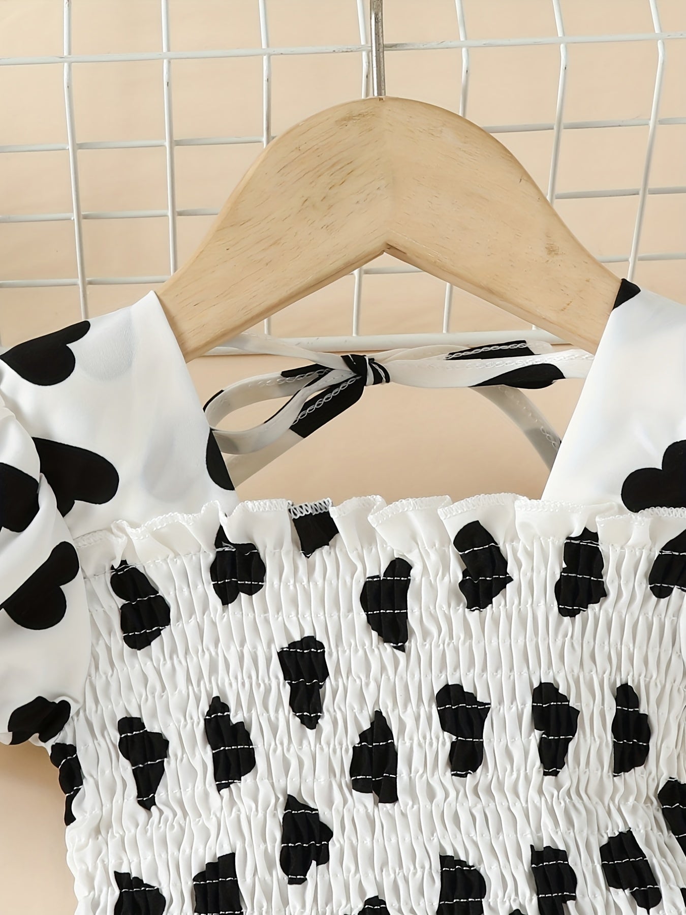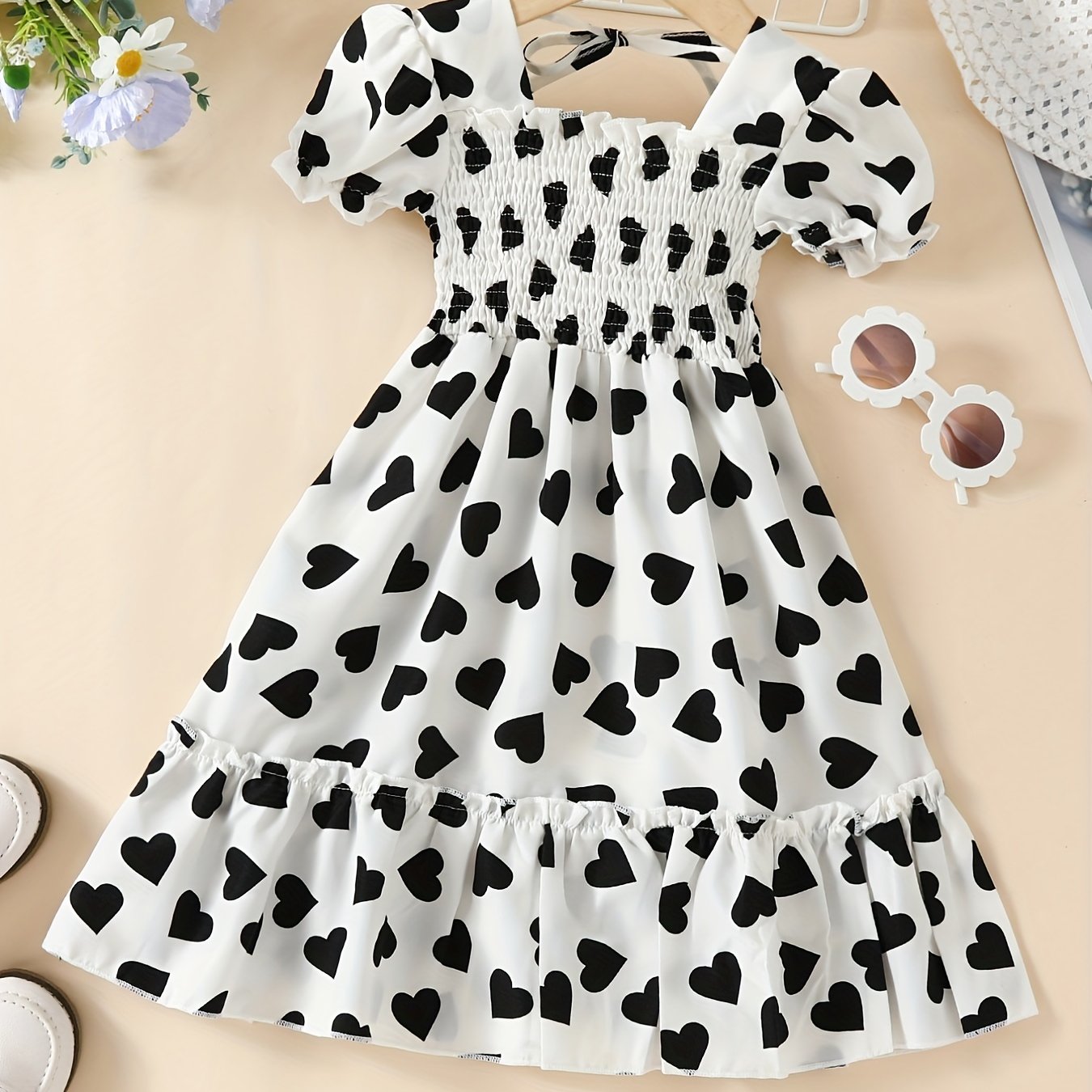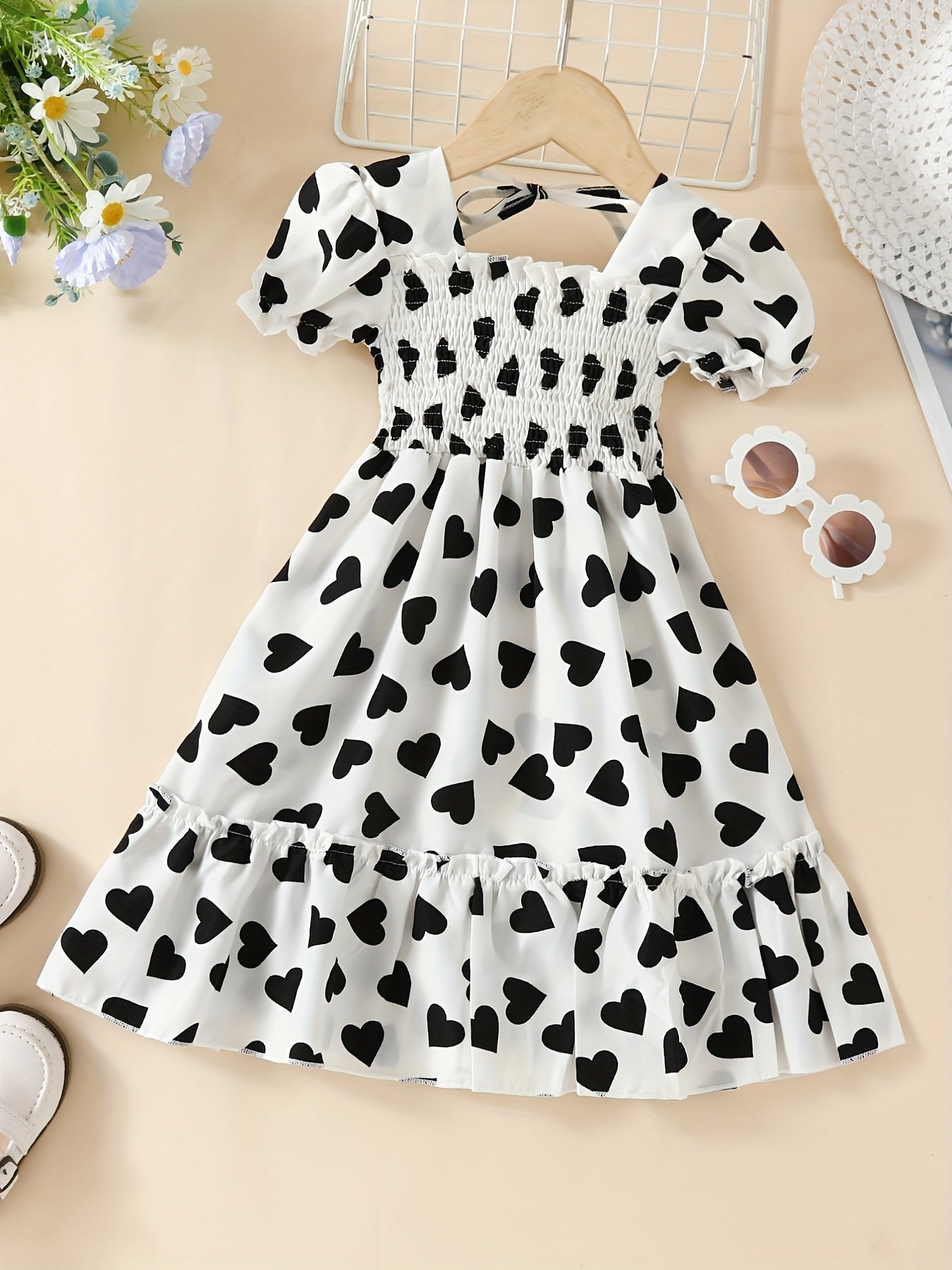Toddler Girls Puff Sleeve Frill Trim Shirred Heart Graphic Ruffled Hem Princess Dress For Party Beach Vacation Kids Summer Clothes