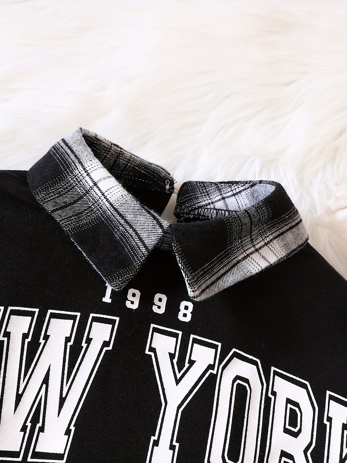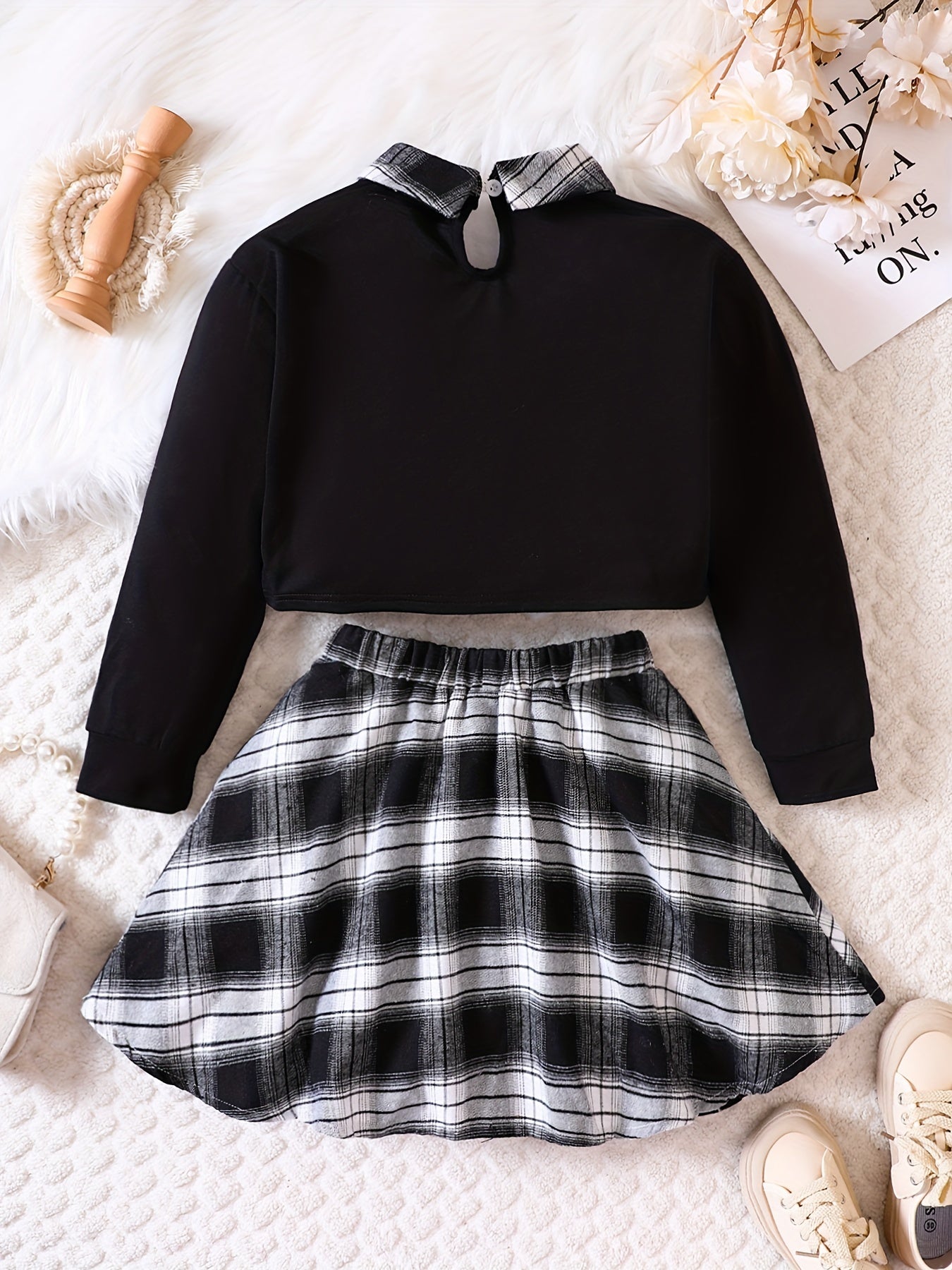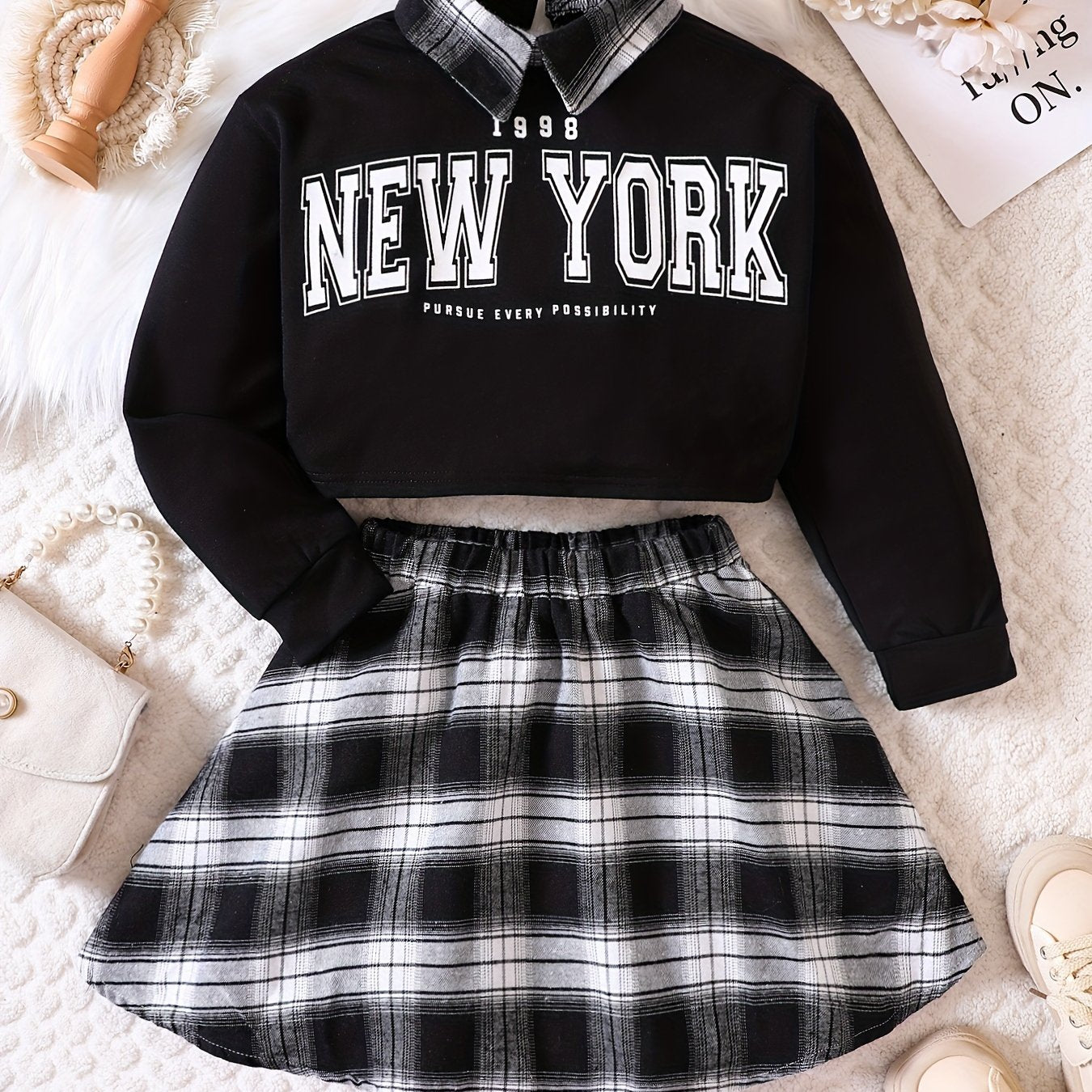 Trendy Girls' 2pcs, NEW YORK Print Lapel T-shirt & Plaid Skirt Set, Preppy Style Sets Kids Clothes For Autumn Party Gift