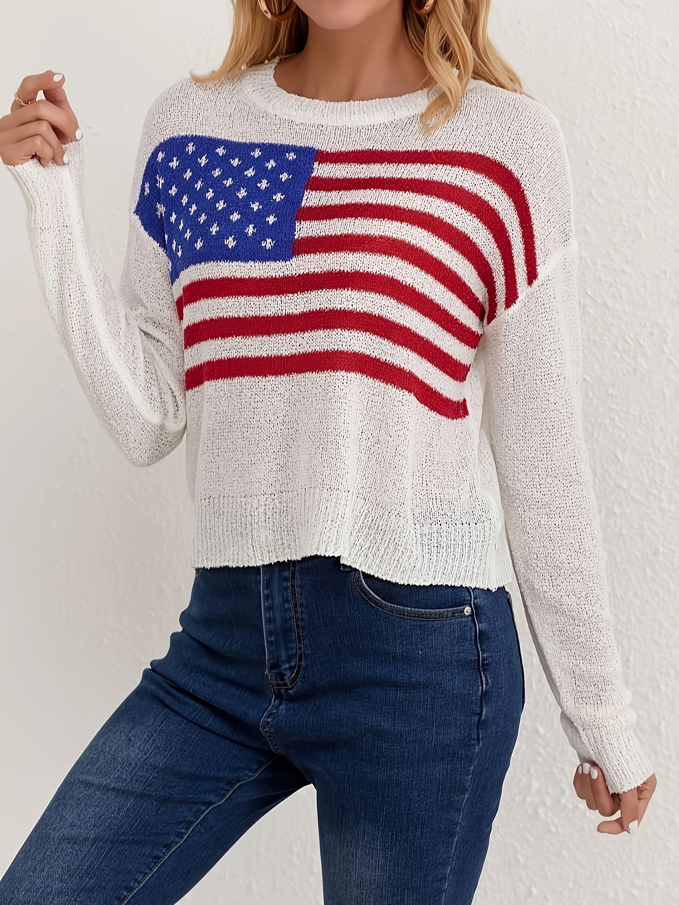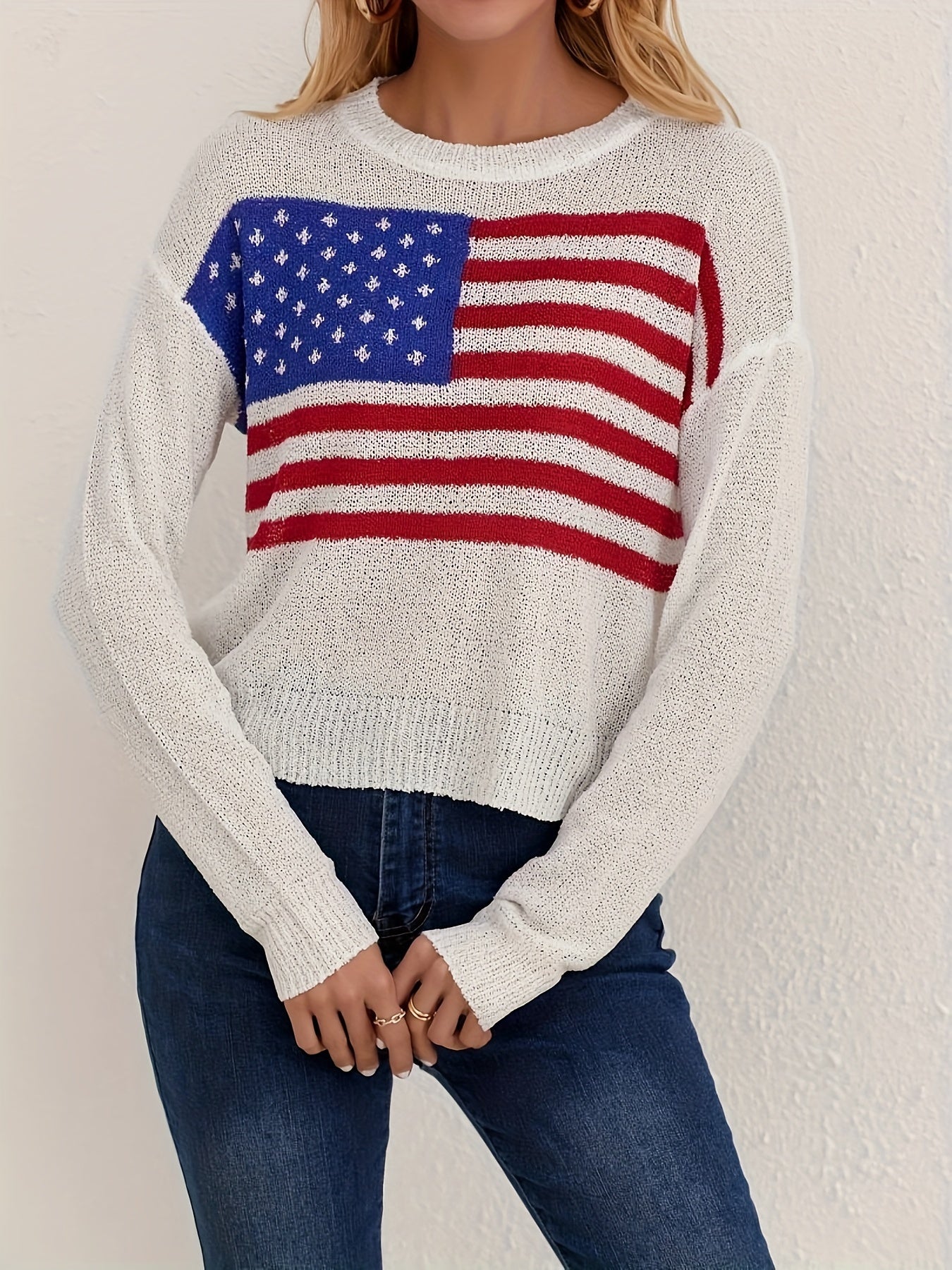 USA Flag Knit Top Patriotic Crew Neck Sweater for Women